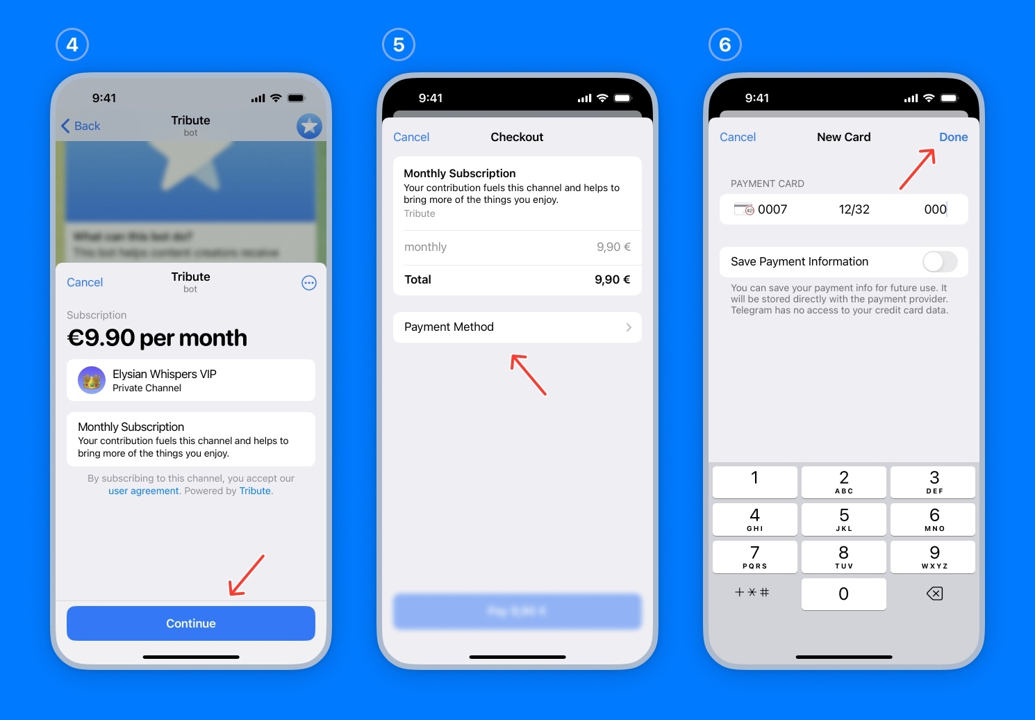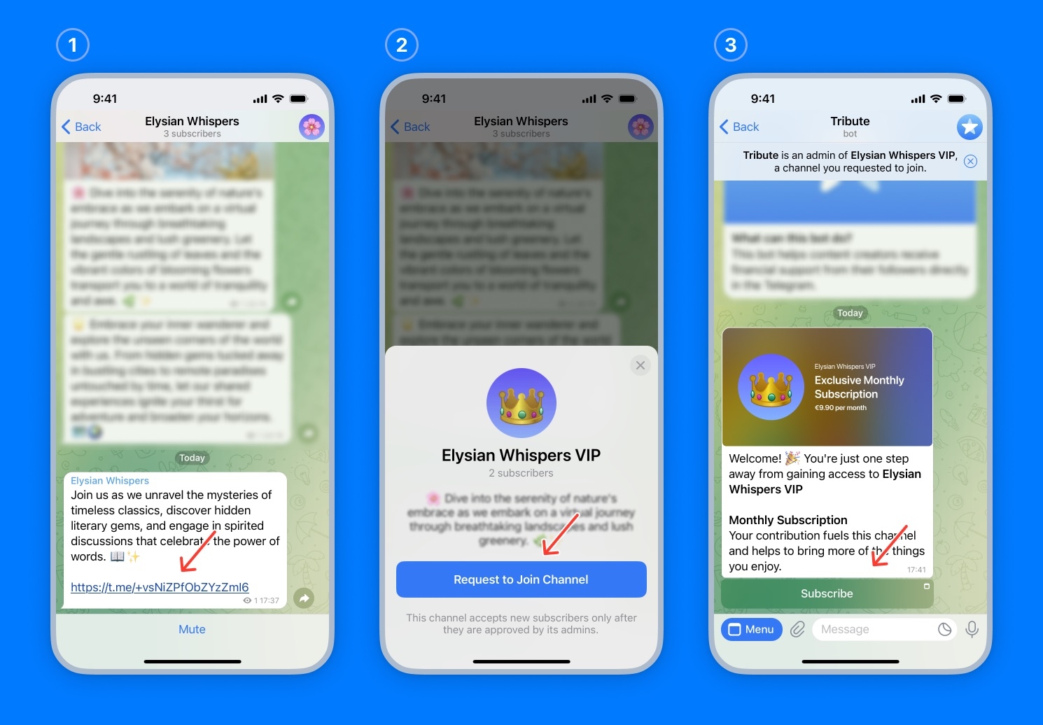 The @Tribute bot will send you a message with a subscription, click the button below that message.